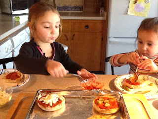 My son came up today with my 2 granddaughters and we had a great time. Princess A always love to make english muffin pizzas with Memere. So of course that's what we did. Princess V has a dairy allergy therefore there's no cheese on hers so chose pickles instead......that's what it's all about....adding whatever they want.